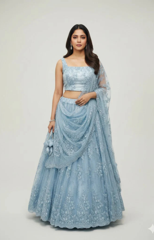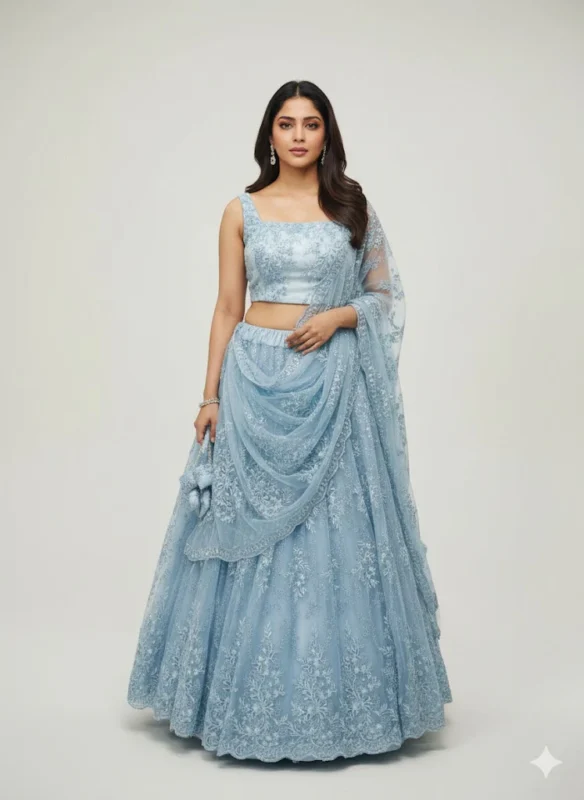 Icy Blue Floral Embroidered Net Lehenga Set