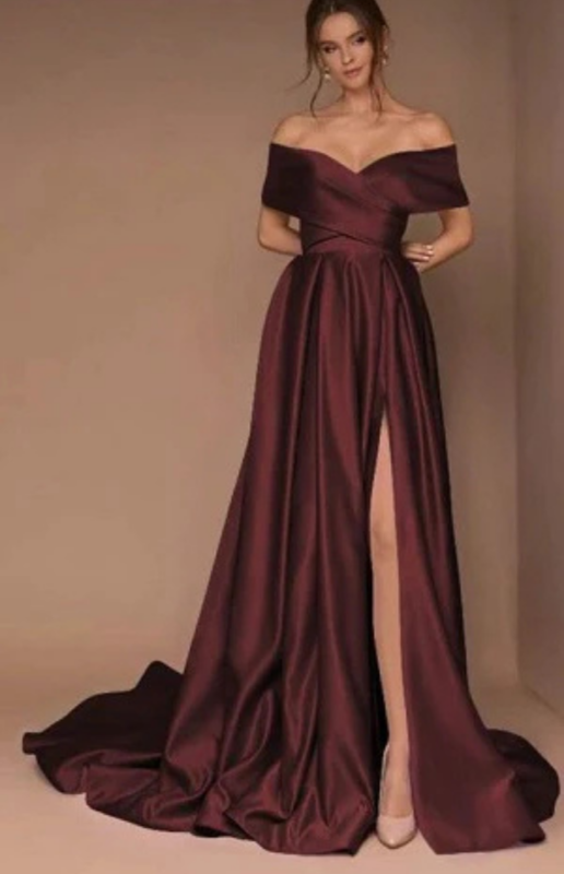 Dark Wine Satin Slit Cut Long Trail Shoot Gown